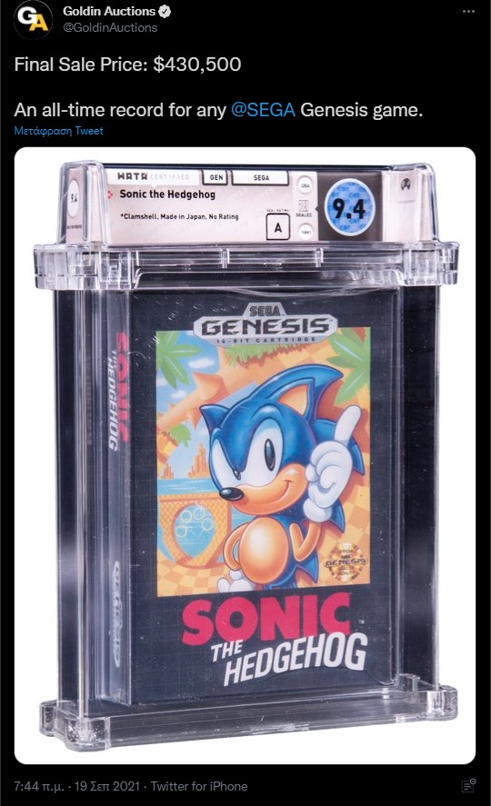 Φίλοι gamers των 80s, ξεθάψτε τώρα το Sega Genesis σας από το πατάρι και αρχίστε την αναζήτηση των παλιών σας παιχνιδιών. Μέχρι και ο “μπαμπάς” του Sonic σοκαρίστηκε όταν έμαθε ότι ο “γιος” του πουλήθηκε έναντι 430.500 δολαρίων σε δημοπρασία του οίκου Goldin, ξεπερνώντας κατά πολύ κάθε προηγούμενη δημοπράτηση οποιουδήποτε παιχνιδιού για το Genesis, αλλά όχι και τον αιώνιο αντίπαλό του, έναν υδραυλικό με μουστάκι -αν έχετε ακουστά. Το Super Mario παραμένει μπροστά, καθώς μια κόπια του πουλήθηκε πρόσφατα έναντι 660.000 δολαρίων.